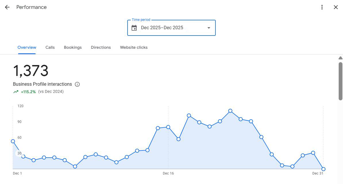 After optimization, the plumbing service experienced a significant uplift in local reach, generating 1373 interactions in just one month and converting a large portion into customer calls. Visibility improved by 115%, helping the business consistently rank for high-intent plumbing keywords and attract more service inquiries.