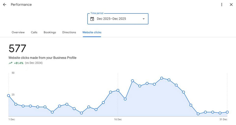 Last month alone the website generated 577 clicks, which turned into 126 inbound leads, and 52 booked jobs directly from the website, showing how powerful a properly optimized website can be for local service businesses.